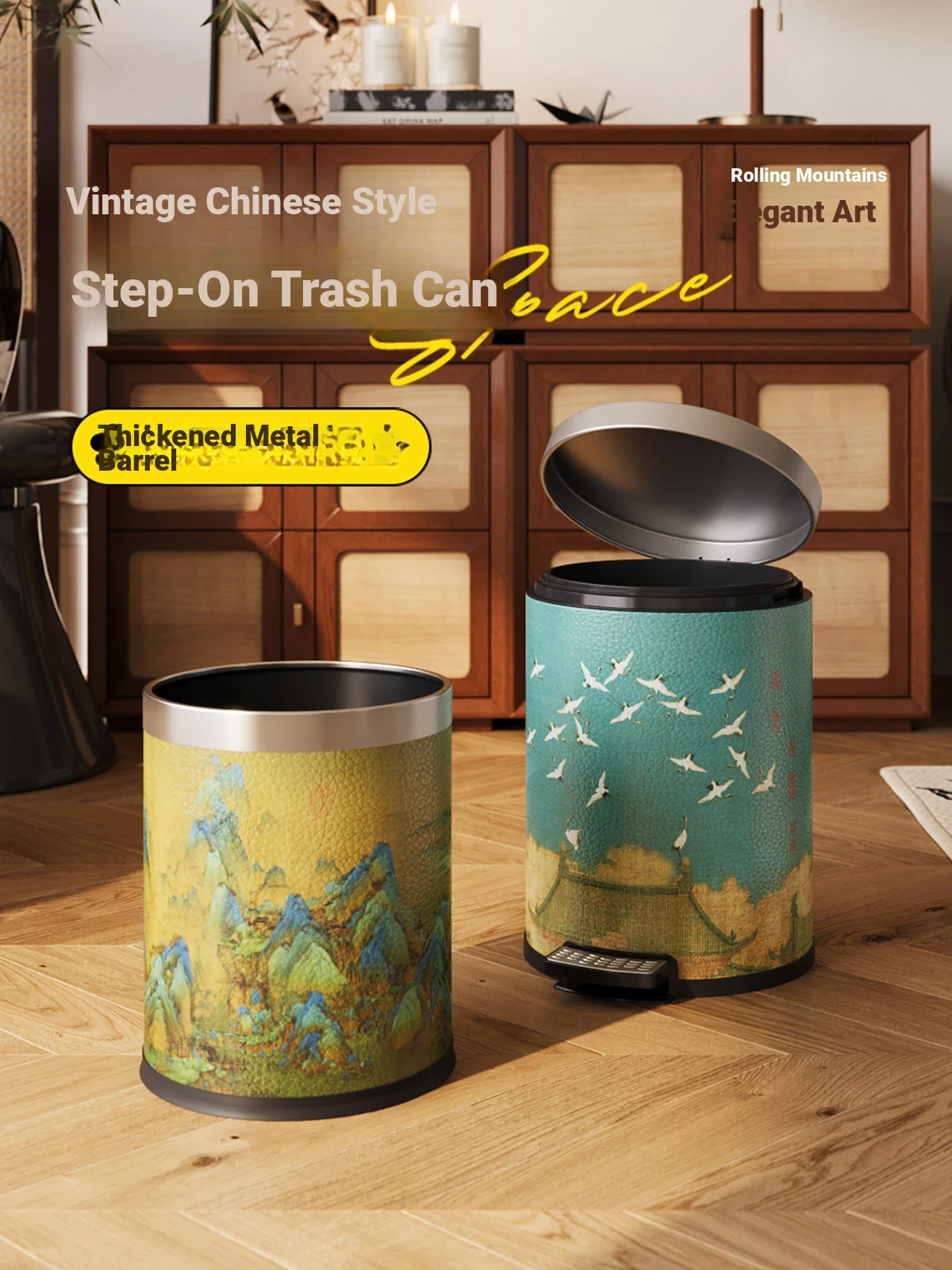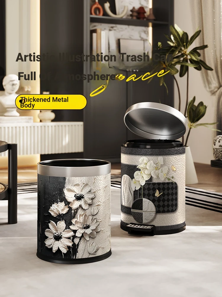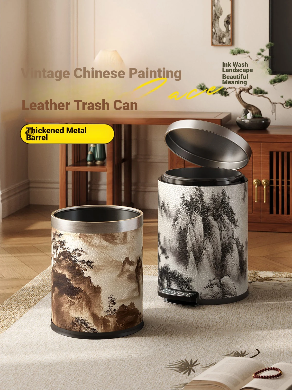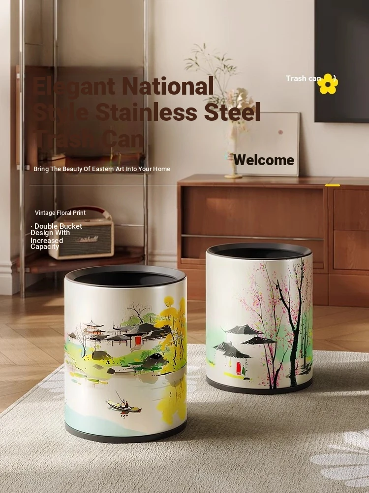 Meisida Large Capacity Stainless Steel Trash Can - Stylish Chinese Landscape Design for Home Use, Ideal for Living Room, Bedroom, and Kitchen