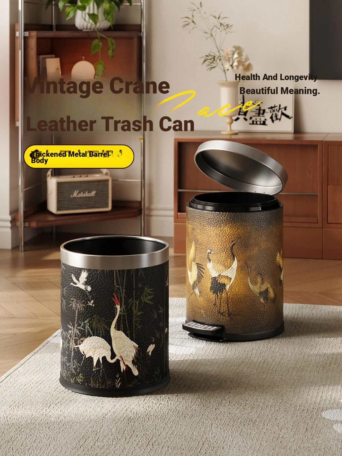 Stylish Vintage-Design Stainless Steel Trash Can with Lid - Large Double-Layer Crane Waste Bin for Home and Living Room