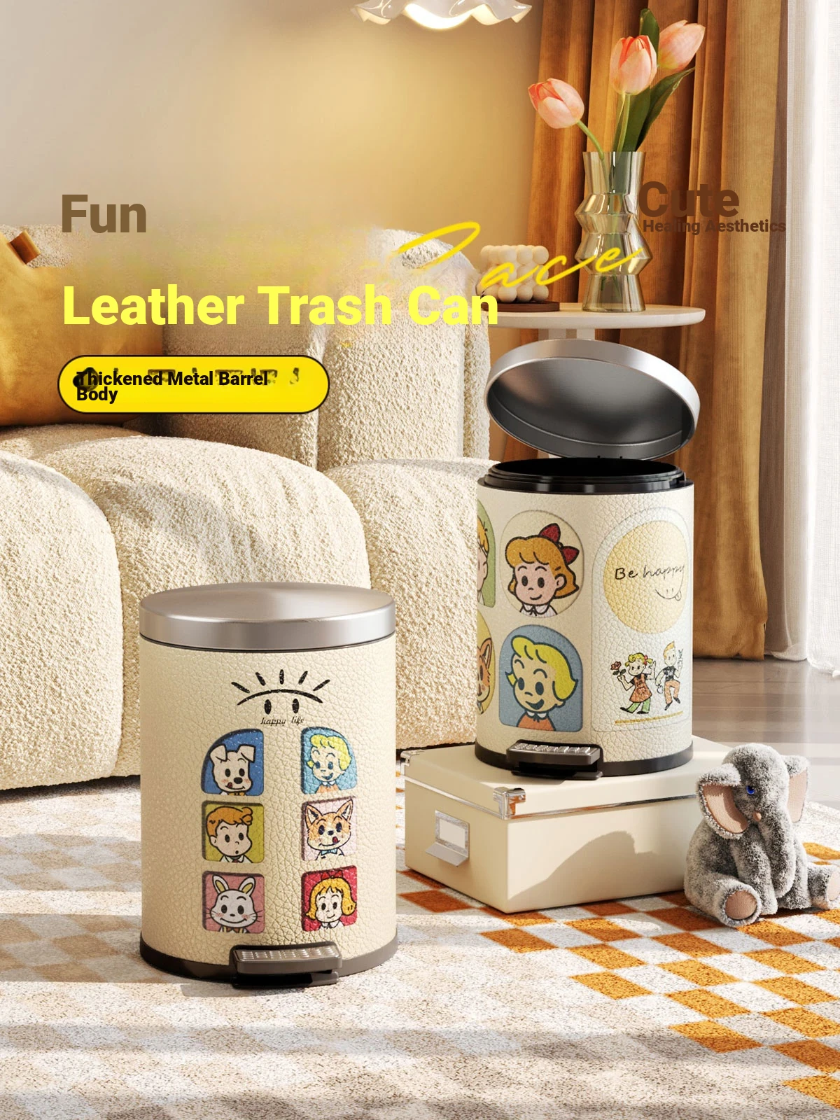 Meisdar Cartoon Lid Trash Can - Large Capacity for Home Use, Perfect for Living Room, Kitchen, and Bathroom - Stylish Cream Color for a Fun and Functional Touch!