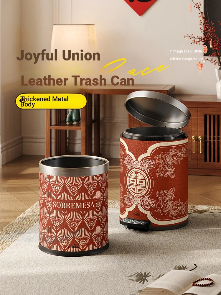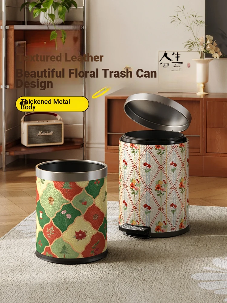 Elegant Retro Leather Stainless Steel Trash Can with Lid - High-End Light Luxury Vintage Style for Living Room, Foot Pedal Design