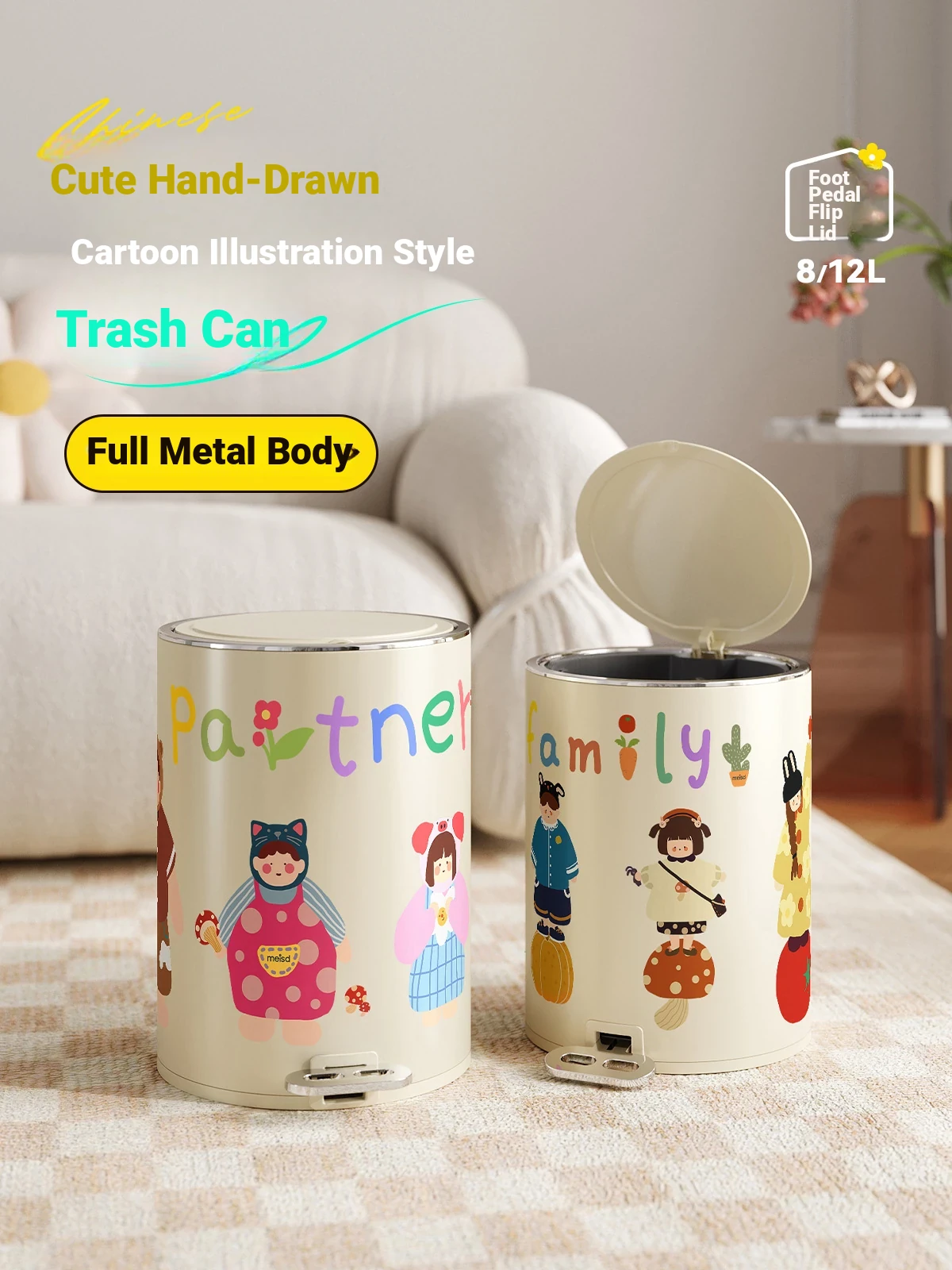 Stylish Meida Stainless Steel Trash Can - Large Capacity Foot Pedal Bin with Eye-Catching Cartoon Design for Living Room and Bathroom