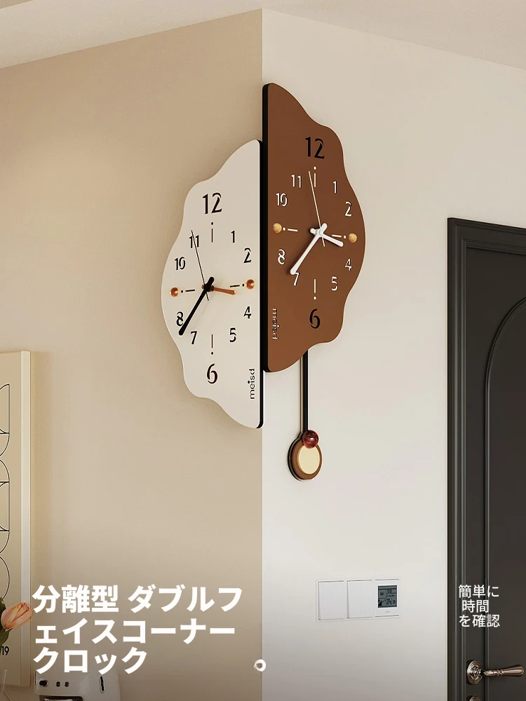 美世达の新作、2025年モデルのモダンシンプルなダブルフェイスコーナーウォールクロック!おしゃれなデザインで、リビングにぴったりのインテリアアイテム。壁の角にぴったりフィットし、空間を有効活用しながら時間をスタイリッシュに表示!