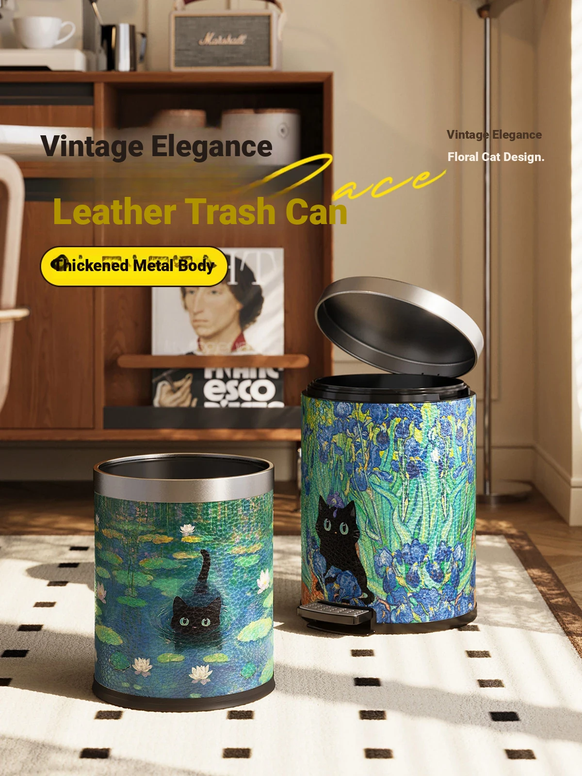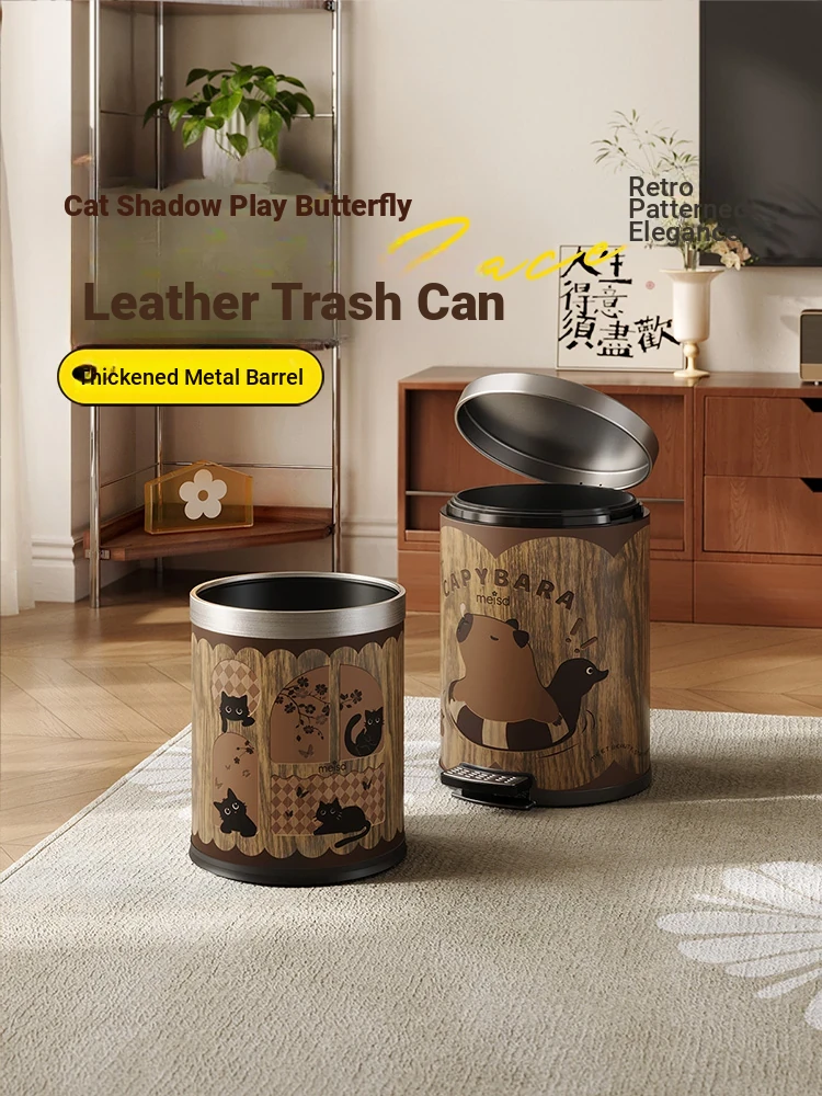 Stylish Stainless Steel & Leather Trash Can - Vintage Cat Design with Lid and Foot Pedal for Living Room and Bedroom - Perfect Home Decor Solution