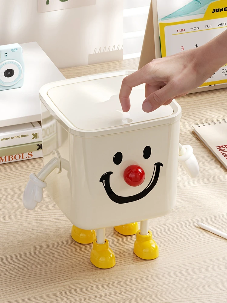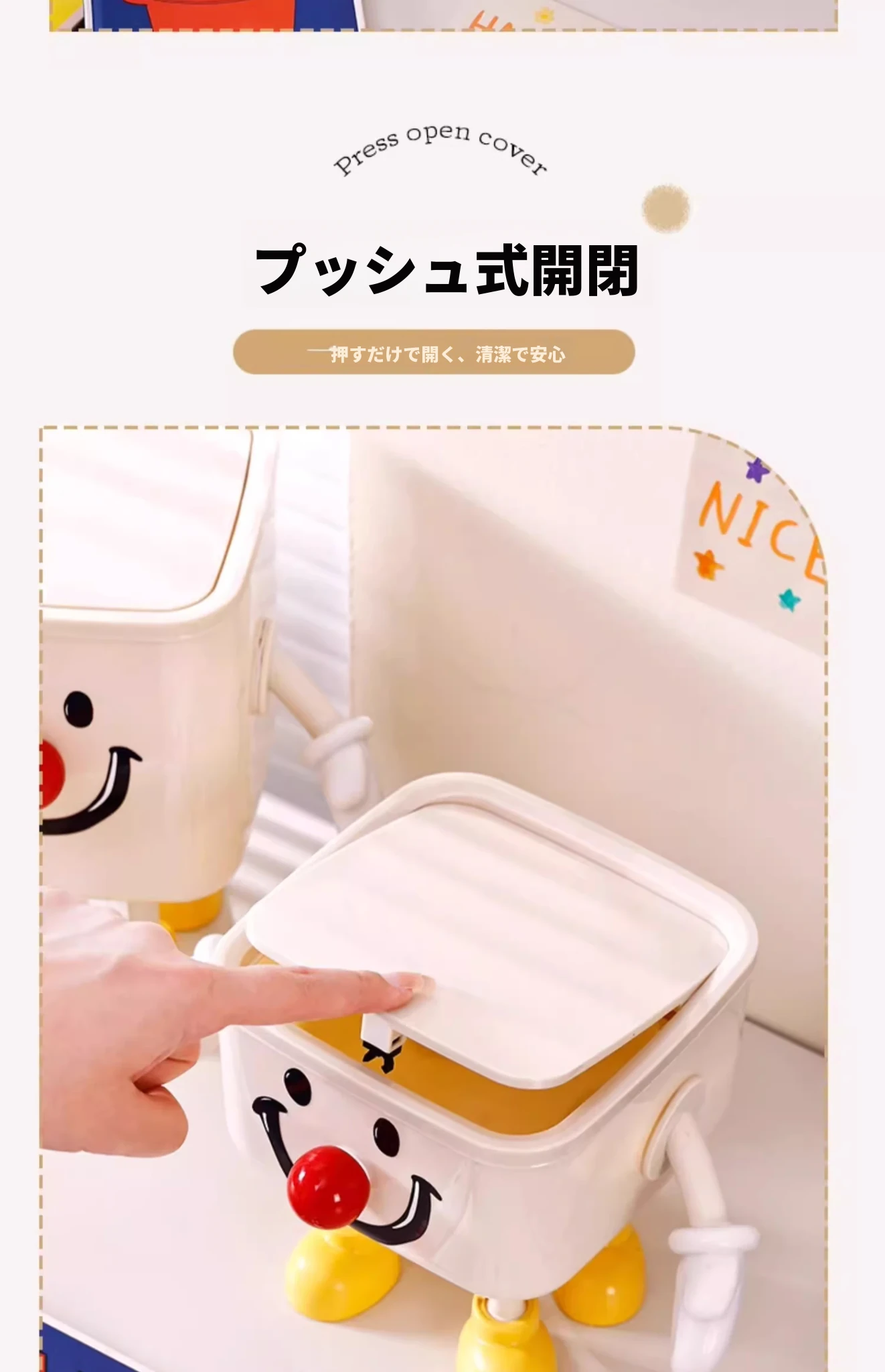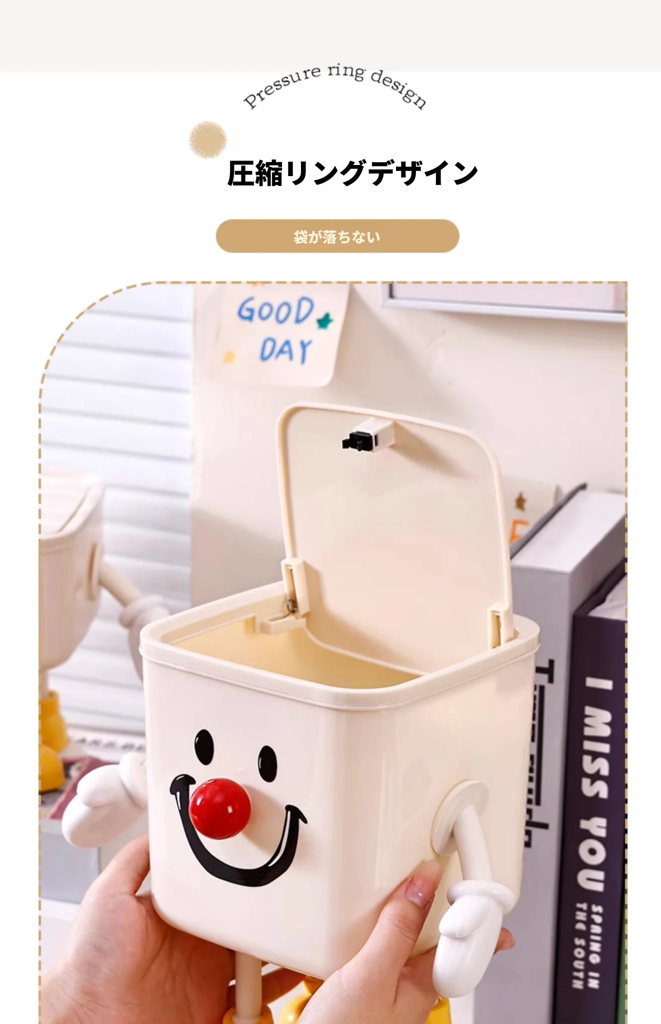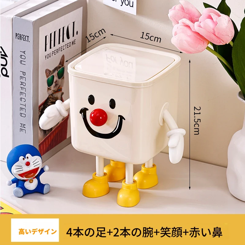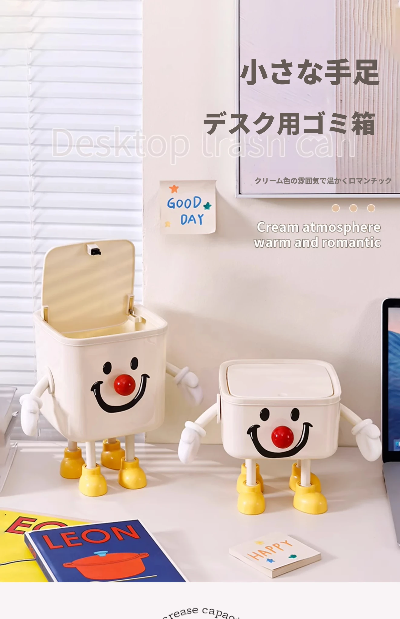 ミスターデザインのかわいいカートゥーンミニデスクゴミ箱!DIYで楽しむ、プッシュ式のふた付きペーパーバスケット。おしゃれで機能的なインテリアアイテムで、あなたのテーブルをスッキリ!