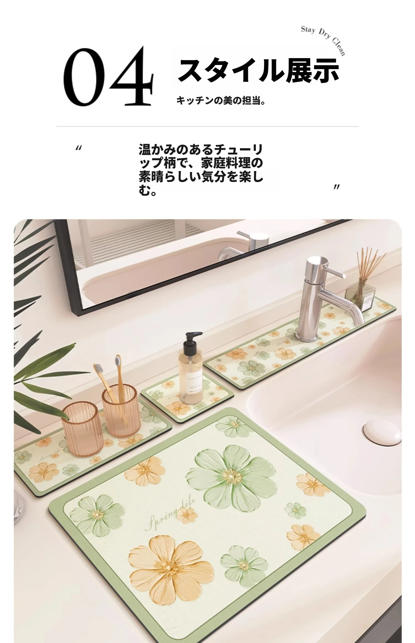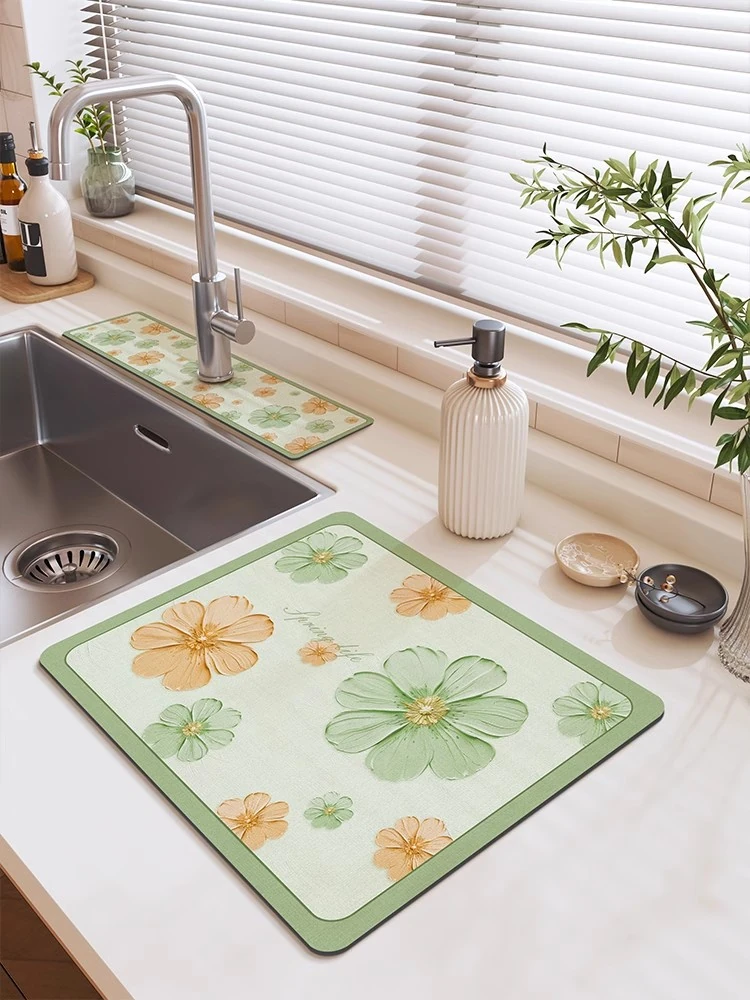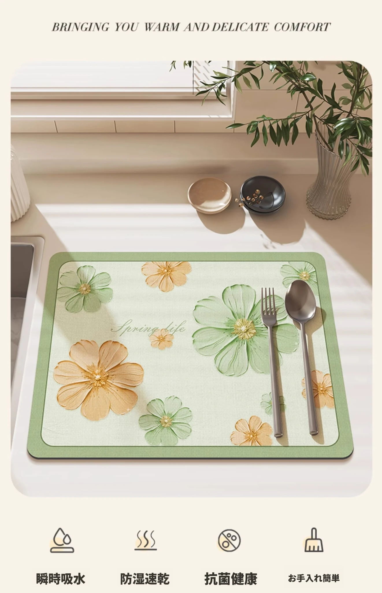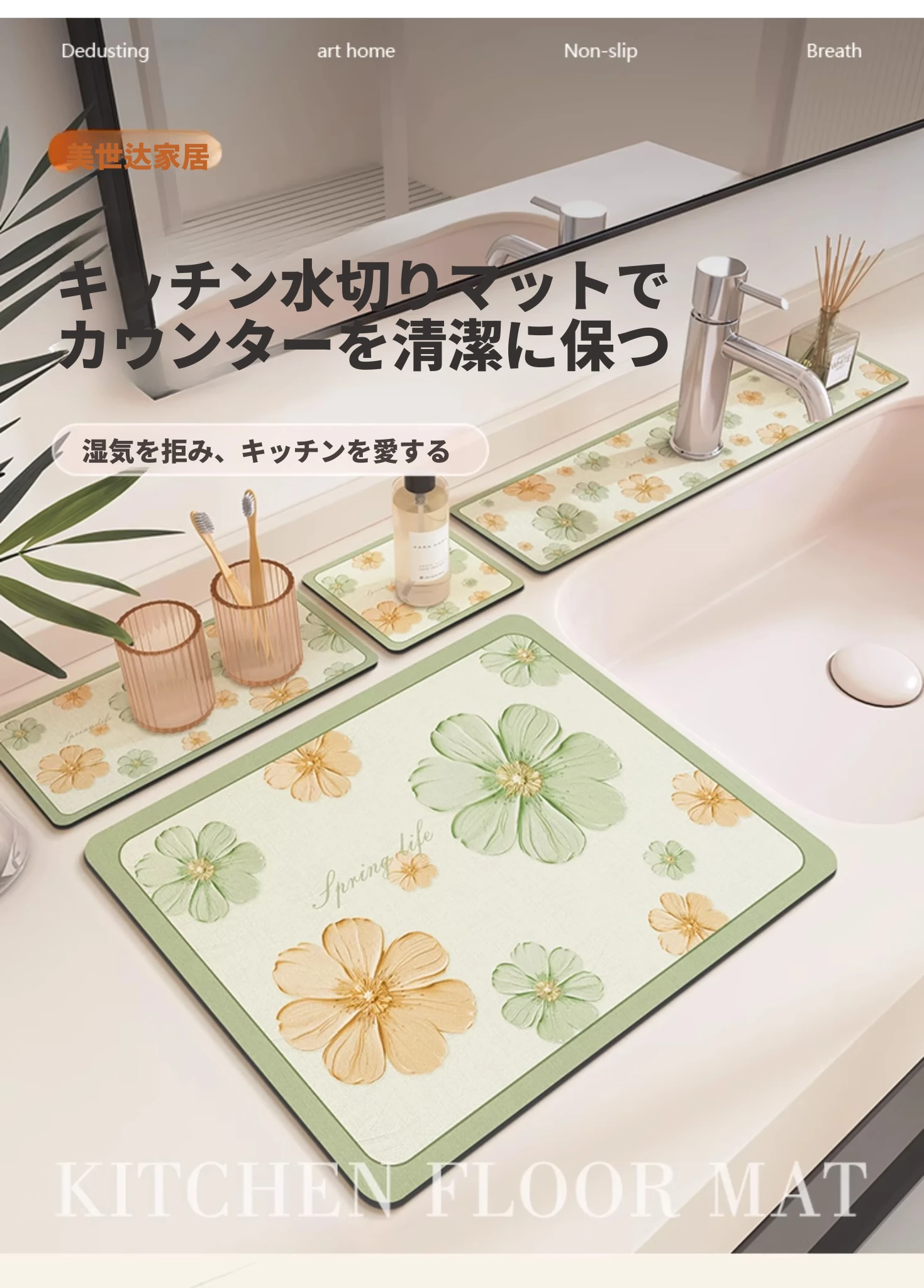 美世达キッチンシンク用吸水マット - カット可能な花柄デザイン、狭いスペースにもフィット!防水・防油汚れで、清潔なキッチンを実現。おしゃれで機能的なアイテムで、毎日の洗い物も楽しく!